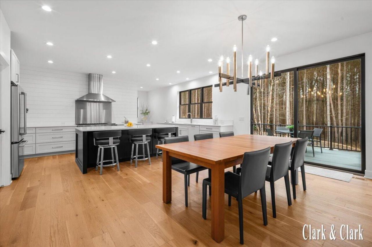 Discover refined luxury in this stunning contemporary walkout ranch, masterfully built by Bruce Heys Builders, set on four private wooded acres within an exclusive 10-home enclave just minutes from downtown Ada.Designed for elegant main-level living, the home is filled with natural light from expansive windows that frame breathtaking forest views. The great room serves as the heart of the home, featuring a striking gas-start wood-burning fireplace flanked by custom built-ins and sophisticated architectural detail.The primary suite offers a serene retreat with dual vanities, a beautifully tiled shower, and a spacious custom walk-in closet designed for both organization and style.The gourmet kitchen is a showpiece, featuring sleek white quartz countertops, a modern open design without upper cabinets, and premium Monogram stainless steel appliances including a 48 gas range. An oversized island with built-in microwave and wine cooler anchors the space, complemented by two pantries and a dedicated coffee bar.The walkout lower level is designed for entertaining and everyday comfort, featuring a spacious family room with a gas fireplace, rustic shiplap accent wall, and custom built-ins. A stylish wet bar with wine cooler, private office, exercise area, and abundant storage create exceptional versatility. Two additional bedrooms and a full bath provide comfortable accommodations for guests.